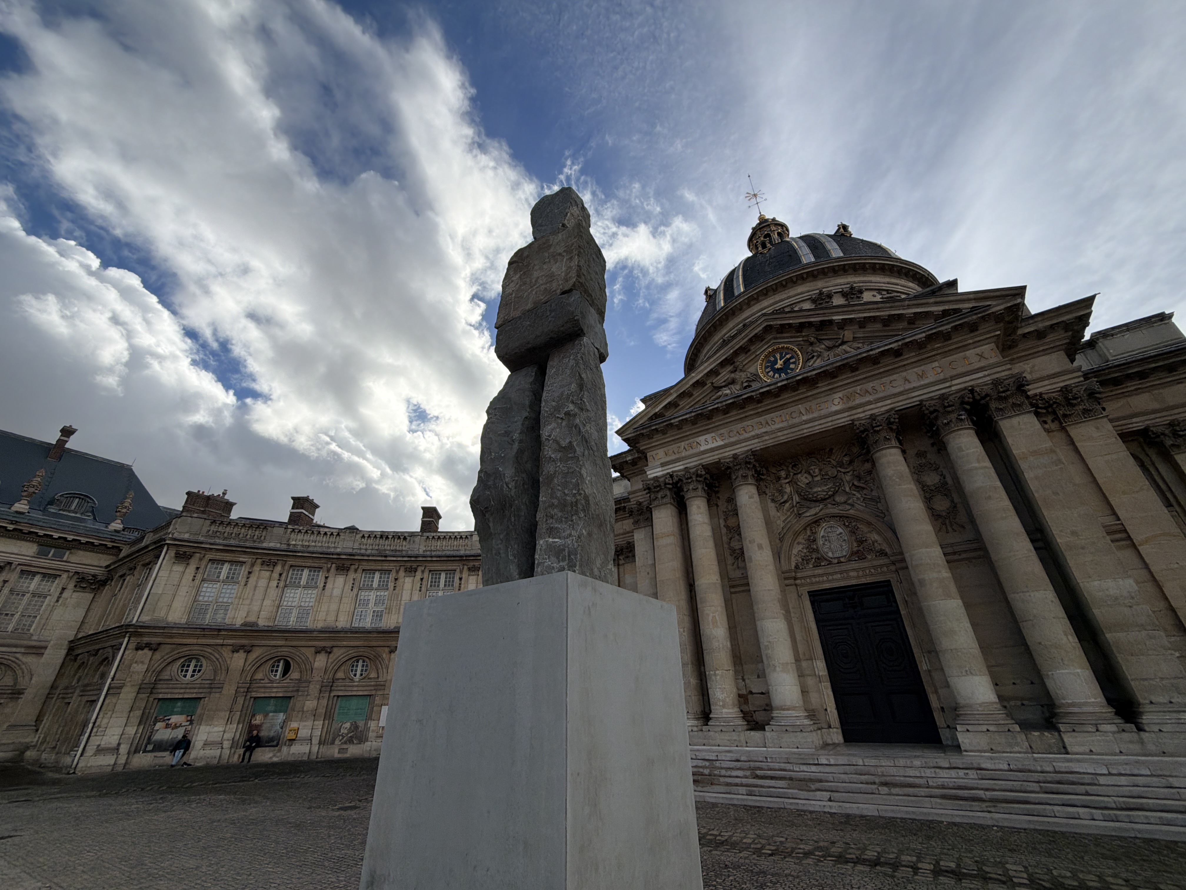 Devant l’Institut de France surgit une figure archaïque, dressée de toute sa hauteur – plus de quatre mètres – comme un totem d’un autre temps. Ugo Rondinone a empilé blocs et volumes de pierre bleue, esquissant têtes, torses et jambes dans une simplicité brute, presque primitive.