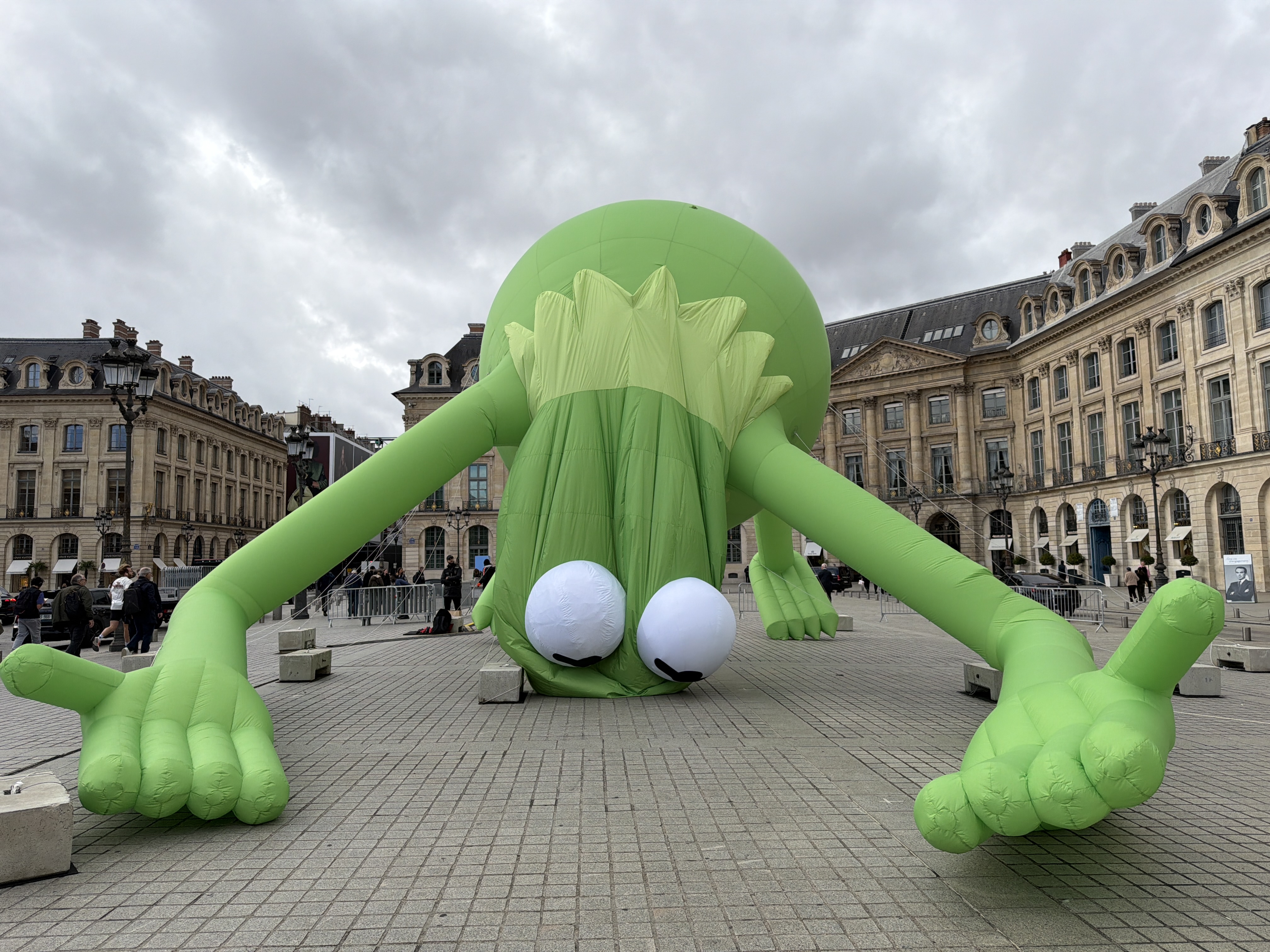 Sur le pavé solennel de la place Vendôme flotte une vision inattendue : Kermit la grenouille, héros candide des Muppets, affaissé comme un ballon échappé d’une parade. Alex Da Corte s’inspire d’un accident réel, l’effondrement d’un ballon géant lors du défilé new-yorkais de Thanksgiving en 1991.