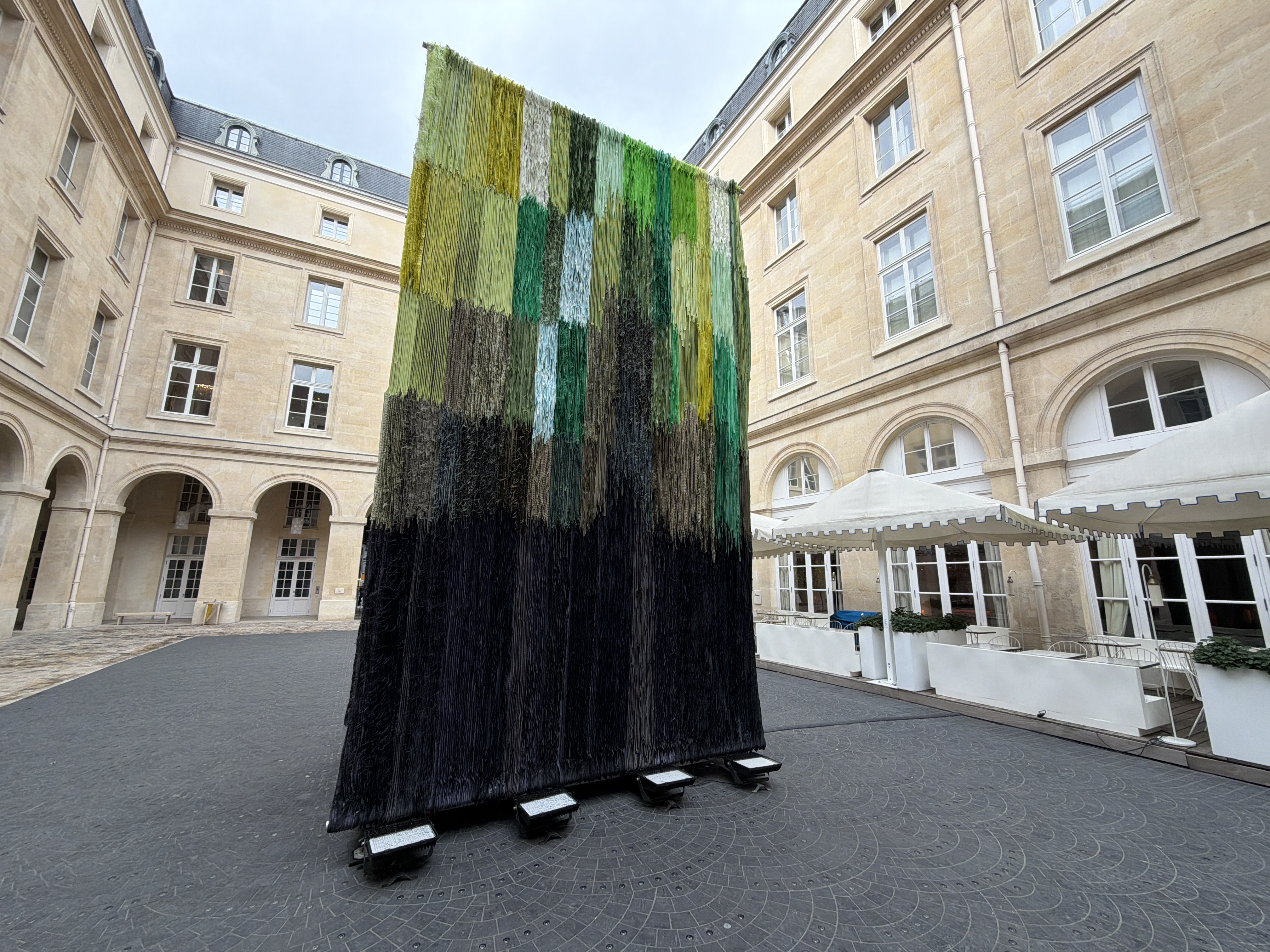 Deux drapeaux de tissus colossaux se déploient dans la cour de l’Hôtel de la Marine comme des herbes folles dressées face au vent. Joël Andrianomearisoa les a tissés de couleurs et de textures denses, paysage textile où la matière prend le relais de la parole.