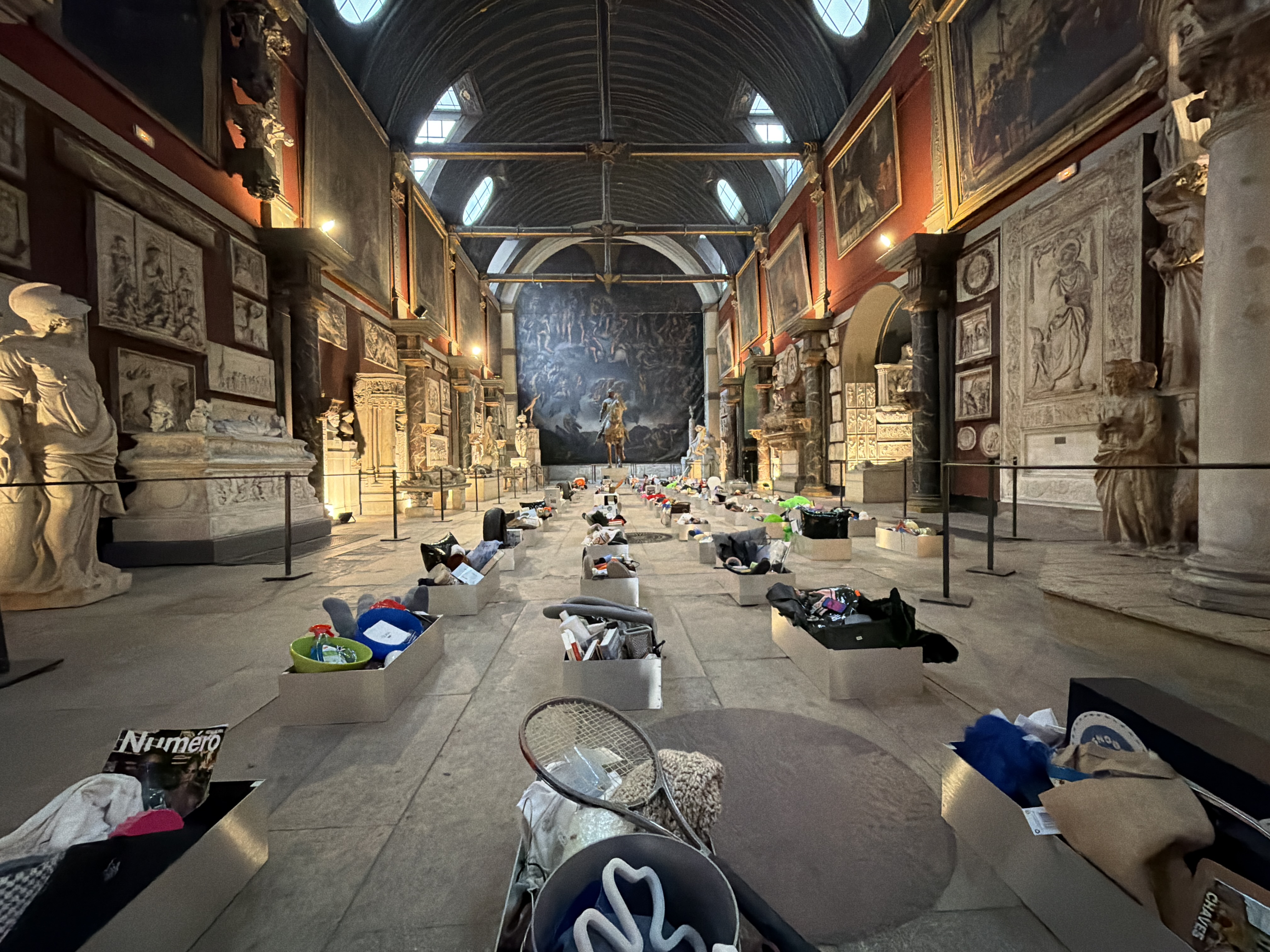 Dans la chapelle des Petits-Augustins, Harry Nuriev remplace l’autel par des cartons de supermarché. Dedans, pas de reliques mais des objets laissés par les visiteurs : un livre oublié, une tasse ébréchée, un jouet cassé. Chacun dépose, chacun emporte. Dans ce ballet discret, le rebut du quotidien devient matière sacrée.