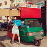 Ici, à Naples, Kourtney Roy poursuit la mythologie personnelle qu’elle tisse depuis des années : un monde parallèle, suspendu entre ironie et mélancolie, où le fantasme se fissure pour laisser apparaître une vérité plus trouble, plus réelle. Ses autoportraits mis en scène, traversés d’ambiances cinématographiques, habitent ces décors d’Italie comme des héroïnes égarées. Un Vésuve qui gronde en arrière-plan, une place de marché éteinte, une façade décrépie : autant de cartes postales ratées qu’elle transforme en paraboles sur la représentation de soi, sur l’écart entre ce que l’on montre et ce qui se cache. Naples devient un théâtre grandeur nature, entre opéra lyrique et improvisation brute. À travers cette nouvelle série, l’artiste canadienne compose une sorte de voyage intérieur en Italie, traversé d’humour noir et de poésie décadente. Ses images, faussement rétro mais résolument contemporaines, déjouent les clichés pour mieux interroger notre désir d’illusion.
