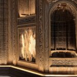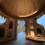 Ici, l’architecture s’effeuille en sous-bois, le minéral converse avec le textile, la coupe du volume prend la douceur d’un pli. Les motifs prolifèrent, se déplacent, se répondent comme des rumeurs de cavité : un relief en appelle un autre, une moulure devient racine, un décor devient charpente. La marche devient méthode – bifurquer, revenir, détourner l’angle pour saisir la face cachée. Rien ne se livre d’un seul regard, tout aspire à la durée du pas, à la persistance rétinienne d’un monde en train de s’inventer.