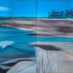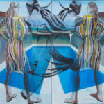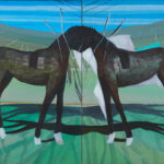 Ici, un ensemble d’œuvres fragmente le réel comme dans un rêve lucide : deux silhouettes se confrontent, s’évanouissent, se traversent – et, dans cet entre-deux, l’espace se dérobe. L’artiste travaille cette porosité des lieux et des temporalités qui fait de sa peinture un territoire d’interférences. Les horizons s’y plissent, les couleurs s’y contredisent, les corps se dressent comme des survivances d’un événement indicible.