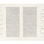 La galerie Karsten Greve rassemble des œuvres récentes issues d’un cycle amorcé à St. Moritz puis à Cologne. Un nouveau motif y apparaît : la cupule. Ces petites cavités creusées dans la pierre, observées sur les sites néolithiques du Morbihan, restent aujourd’hui sans interprétation définitive. Ici, elles deviennent des points de silence, des centres autour desquels la composition s’organise. Le regard ne plonge pas dans l’image ; il reste à la surface, attentif à ce qui affleure. Cette attention à la surface est essentielle dans son travail. La peinture agit comme une paroi, un mur, parfois même comme un couloir que l’on traverse. Les formes se détachent à peine, souvent en léger relief, et la répétition, accompagnée de variations presque imperceptibles, installe un rythme lent. Ici, la peinture ne cherche pas à représenter, mais à produire une présence. Dans certaines œuvres, une écriture manuscrite apparaît, volontairement difficile à lire. Elle provient de textes anciens – les capitulaires de Charlemagne – qui visaient à faire disparaître les traces des cultes païens, notamment les mégalithes. Les mots simulacre, sacrilège et anathème y sont isolés, répétés, vidés de leur autorité première. Transformés en signes, ils interrogent la manière dont une image peut être rejetée, effacée ou redoutée. Par son économie de moyens et son refus de la spectacularisation, Loïc Le Groumellec se tient à contre-courant de la saturation visuelle contemporaine.