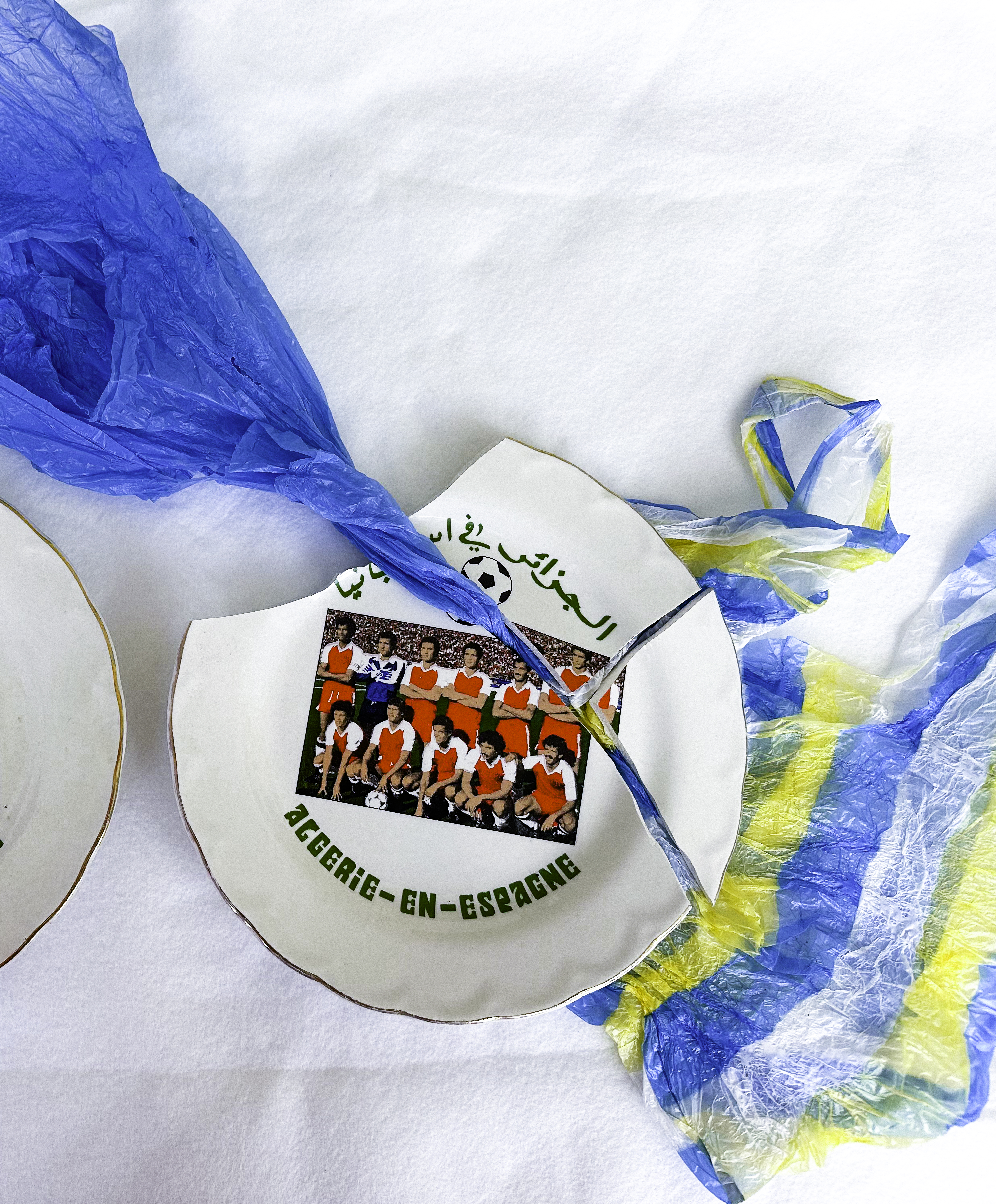 Non pour rejouer la même scène, mais pour en étirer les lignes, déplacer les règles et interroger ce que le sport promet – et ce qu’il laisse derrière lui. L’espace d’exposition devient un terrain à arpenter. On y circule comme dans des vestiaires après l’effort, entre surfaces carrelées que l’on gratte jusqu’à l’épuisement, céramiques disposées comme des talismans fragiles, portraits d’enfants qui portent sur leurs maillots les noms d’icônes planétaires. À mesure que l’on avance, la fête sportive se trouble. La lumière des projecteurs révèle aussi ses angles morts. Le rêve d’ascension sociale, si souvent associé au football ou à l’athlétisme, est ici examiné sans naïveté. Derrière les étoiles cousues sur certains maillots, combien de trajectoires avortées, de corps éprouvés, de promesses non tenues ? Le terrain devient révélateur des déterminismes économiques, raciaux et symboliques qui orientent les parcours bien avant le coup d’envoi. Chacune des artistes apporte sa langue propre. M’barka Amor tisse des récits intimes et diasporiques où mémoire et résistance s’entrelacent. Ouassila Arras travaille la matière comme on fouille une archive, faisant émerger les silences d’une histoire franco-algérienne encore vive. Dalila Dalléas Bouzar, fidèle au portrait comme outil critique, confronte le regardeur à des visages qui condensent à la fois fierté, vulnérabilité et tension. Ensemble, elles déplacent le jeu vers un espace plus vaste que celui des stades. Ce qui se joue ne relève plus seulement de la performance, mais d’une lutte pour la représentation et pour la possibilité même de rêver.