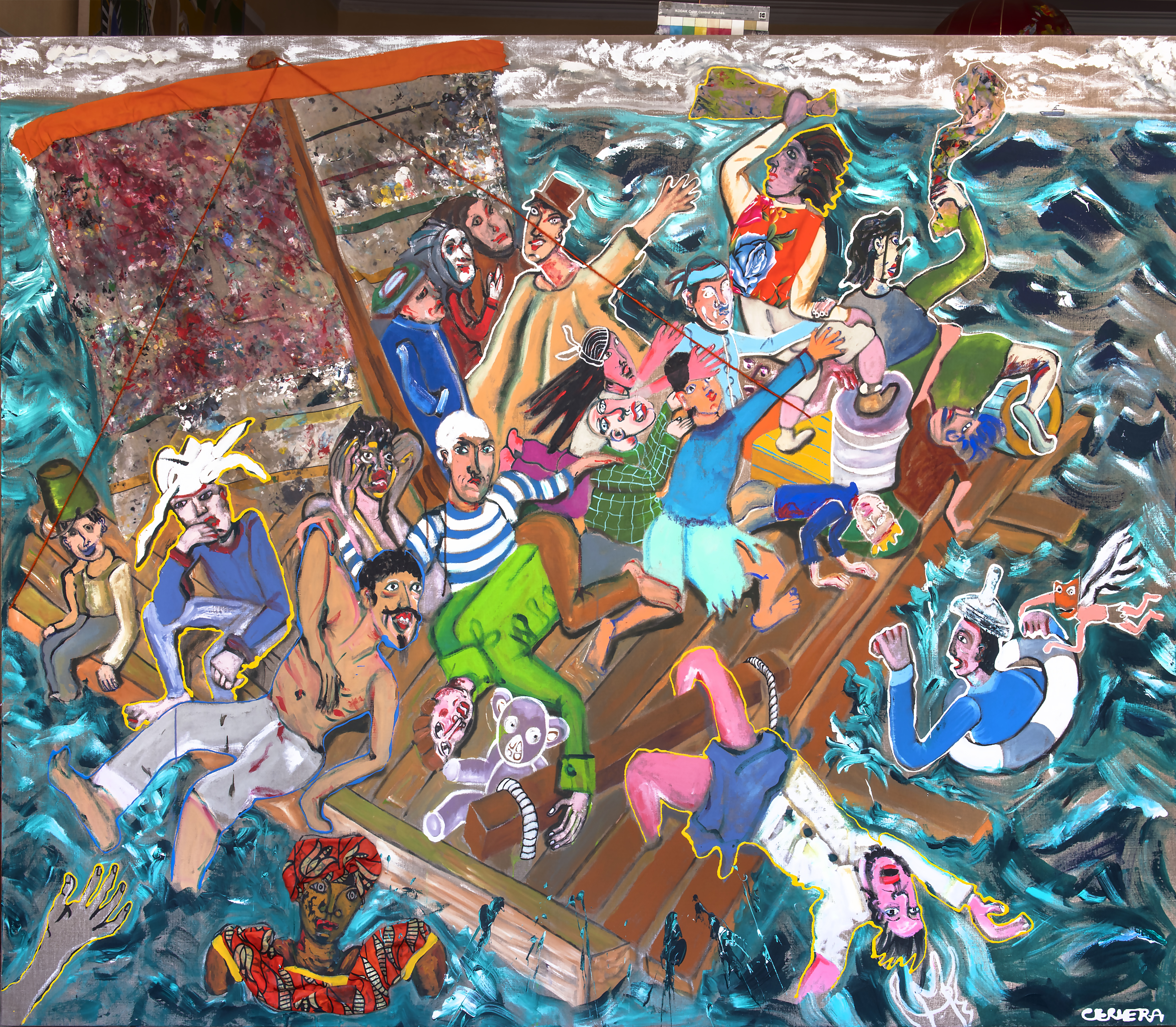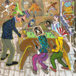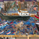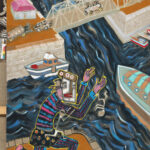 La peinture peut-elle encore être un champ de bataille ? Avec ses carambolages, André Cervera répond sans détour. Oui – si l’on accepte que les images se confrontent, que les souvenirs s’entrechoquent, que les cultures se heurtent sans chercher l’harmonie. Le carambolage n’est pas un accident chez lui. C’est une méthode. Né à Sète, Cervera puise d’abord dans la matière vive de son enfance. Le port, les grues, les retours de pêche, la « rue des fous », les affiches de films de série B collées dans la mémoire adolescente. Dans Ceci n’est pas un mardi, les mercredis passés à la salle de jeux ressurgissent sous forme de plongée cinématographique, traversée de références à Bruce Lee et à Magritte. Sa ville natale devient un théâtre mental au cœur duquel l’intime rencontre les tensions sociales et politiques. Puis le cadre s’élargit.