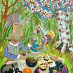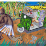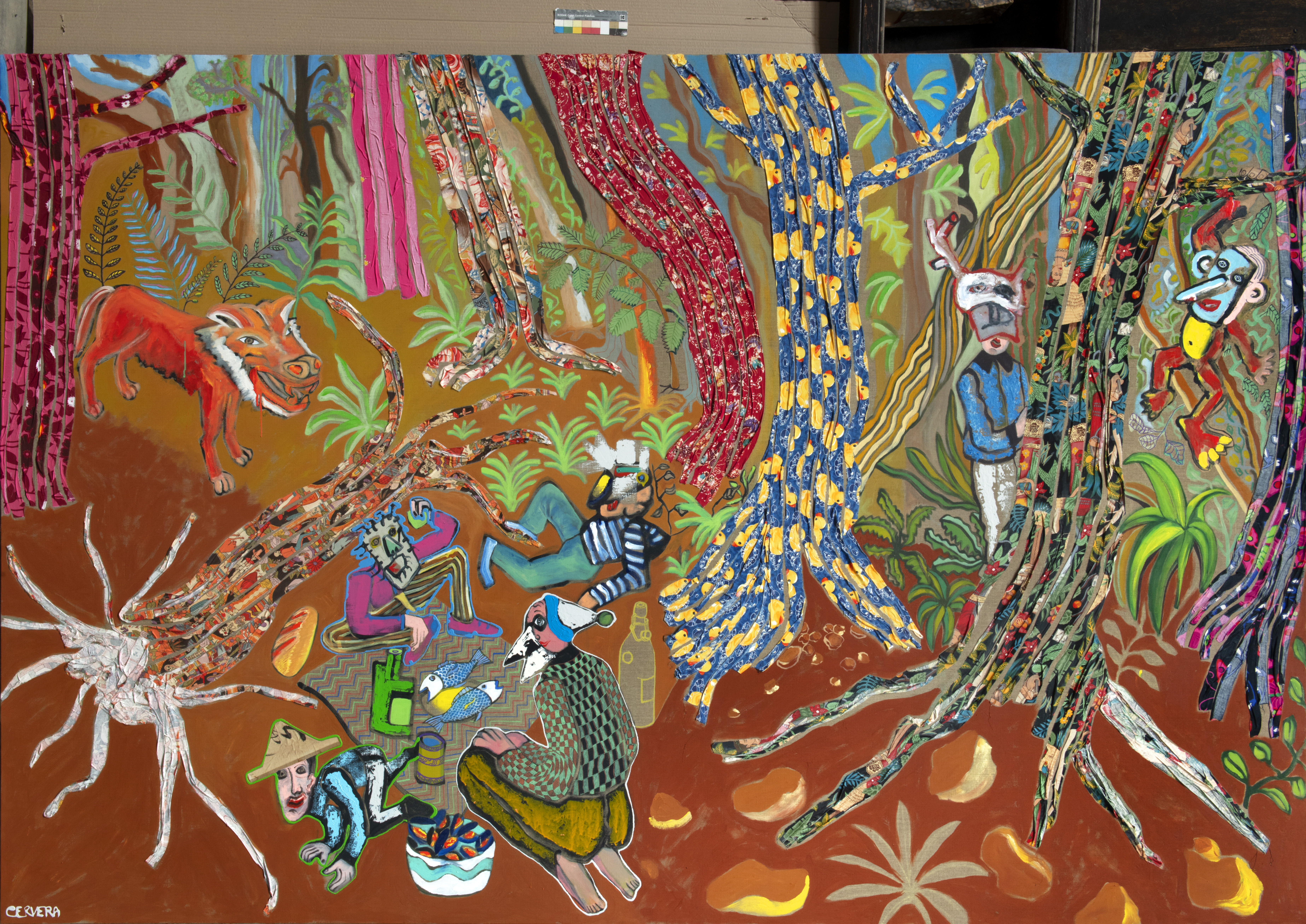 Les canaux de Sète dialoguent avec Shanghai ou Calcutta. Les mythologies croisées au Sénégal, au Mali ou en Inde infiltrent les surfaces. Dans Naranja, l’orange sacré des icônes indiennes embrase la toile ; ailleurs, un fantôme chinois glisse dans une nature morte. Le proche et le lointain s’imbriquent. L’histoire de l’art elle- même entre dans la collision. King Kong et Godzilla côtoient Manet ou Matisse.