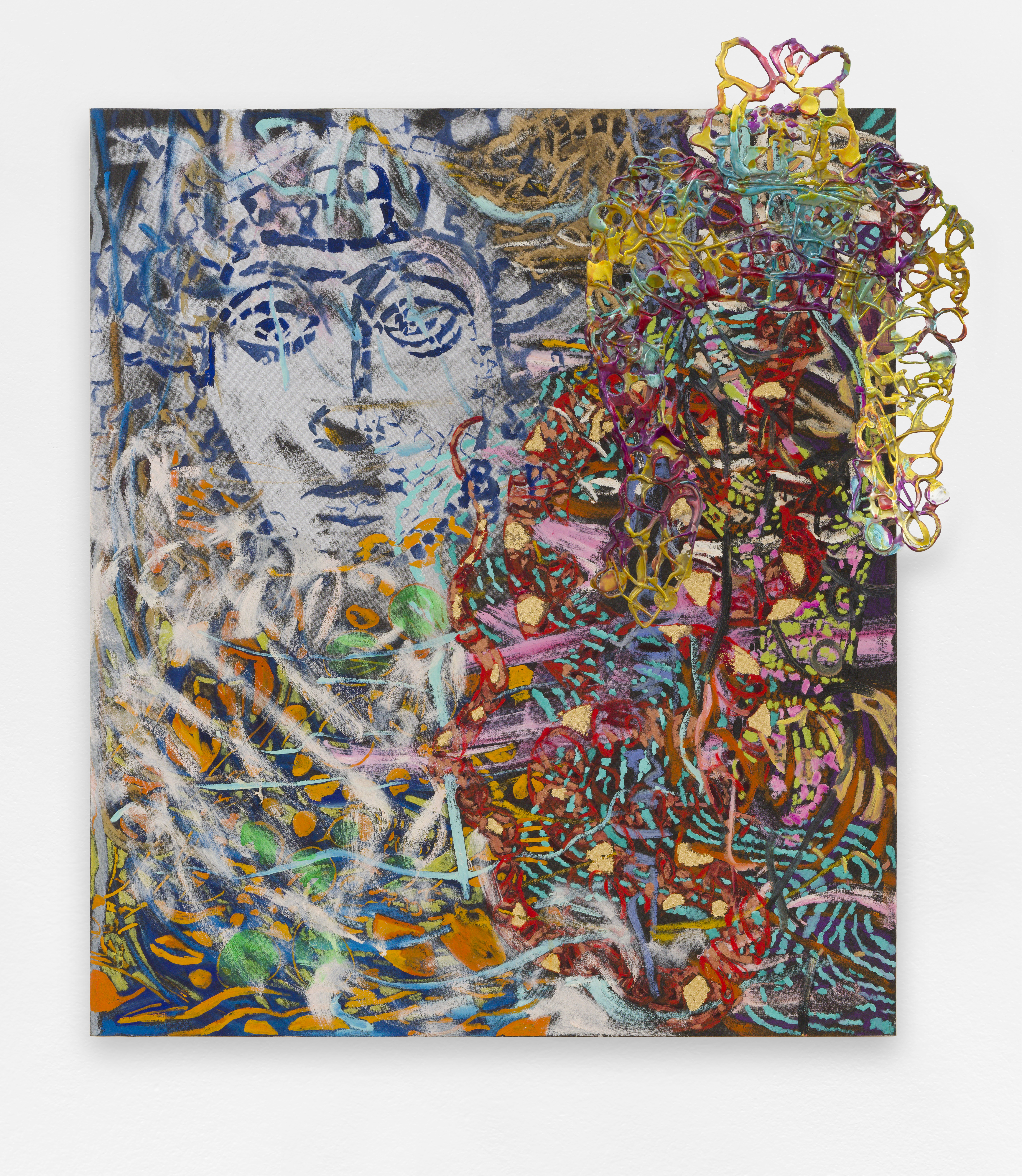 Ceysson & Bénétière réunit des œuvres de 1977 à 1990 : pastels, huiles, gouaches, mais aussi paillettes, feuilles d'or, encaustique et aluminium intégré aux toiles. Méthode rare : partir d'une reproduction en noir et blanc, petit format, puis la recomposer jusqu'à la métamorphose. Une savante à l'œil de peintre.